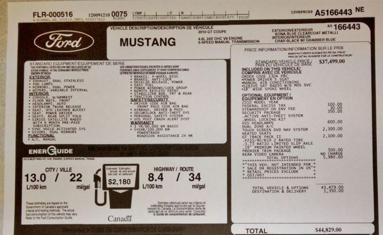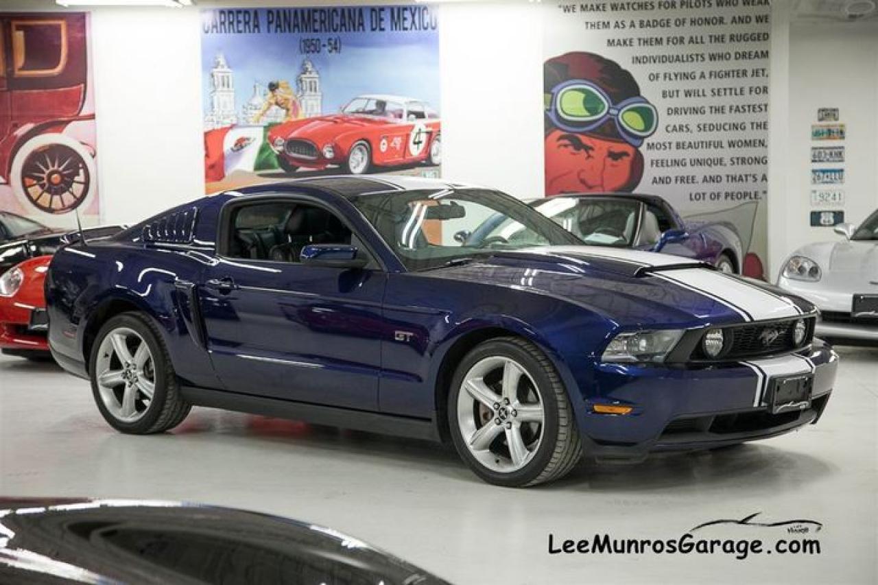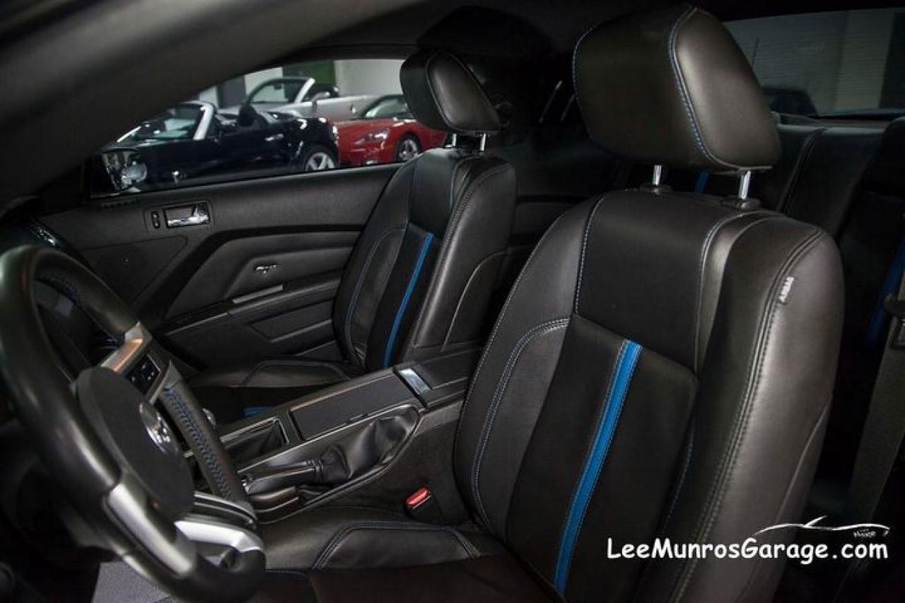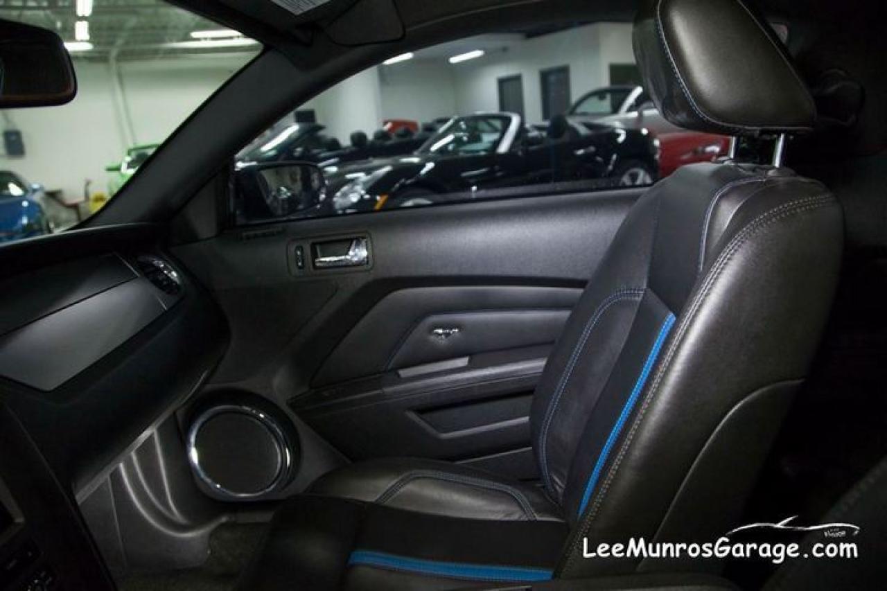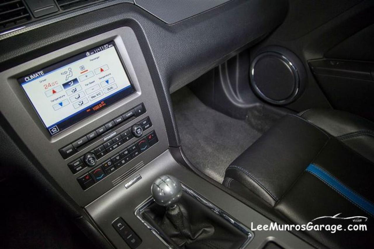 KONA BLUE GT This is a loaded GT MODEL plus; NAVIGATION SYSTEM with voice activation. This GPS linked option offers Route Guidance, reading upcoming street names aloud, detecting traffic incidents, and offering alternatives. Upon request, Travel Link provide lowest fuel prices, real time traffic, weather, sports info and movie listings. You've also got nearly 10 gigs of storage space available, meaning you can manage your music with the Jukebox, rip up to 2400 songs, and even load pics to your home page. REAR VIEW CAMERA; A full colour image of what’s in back is projected in front of you on the Navigation screen. An overlaid grid adds a directional assist. FORD SYNC developed with customizable media system that integrates your Mustang with most Bluetooth®-enabled phones and digital media players. Plug your player into the USB port and press a button on the steering wheel: tunes are at your command. For cellular use, enter the car with a compatible and paired Bluetooth-enabled phone: SYNC knows you’ve arrived. This system also provides direct-connect 911 Assist,TM3 and you can request a Vehicle Health Report as you see fit. TRACKPACK includes dual piston front calipers with performance brake pads, performance 3.73 axle ratio, re-calibrated Advance Trac® electronic stability control,1 GT500® front and rear stabilizer bars, front strut and rear shock tuning, rear GT500 lower control arm, 19 premium painted wheels, performance tires. PREMIER TRIM With Color Accent Package includes Charcoal Black interior environment with colour accented seats, unique door trim with bright pony badge, dark-aluminium instrument panel, and aluminium shift knob. GT Coupe Accessory Package 4 includes; hood scoop and pedestal spoiler. HID headlight pkg and SECURITY Package includes; Active Anti-Theft System, The security package adds a tilt detection, sonic sensor for the interior and separate horn that is hidden inside the rear of the car , it also works in conjunction with the vehicles PATS system to disable the ignition in event of alarm event... is also includes wheel locks. Check for lower insurance rates with this option. 12 months of warranty, up to $12,000 per claim with 12 months of CAA coverage included! See the original window sticker in the photos.